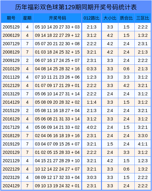 其中红球的012路比为3:2:1,三区比为2:2:2,大小比为4:2、质合比为2:4。
