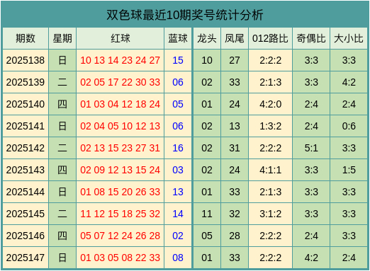 上期回顾:双色球第2025147期:红球01、03、05、08、22、33;蓝球08,其中红球012路比为2:2:2,奇偶比为4:2,蓝球开出偶数号码08。