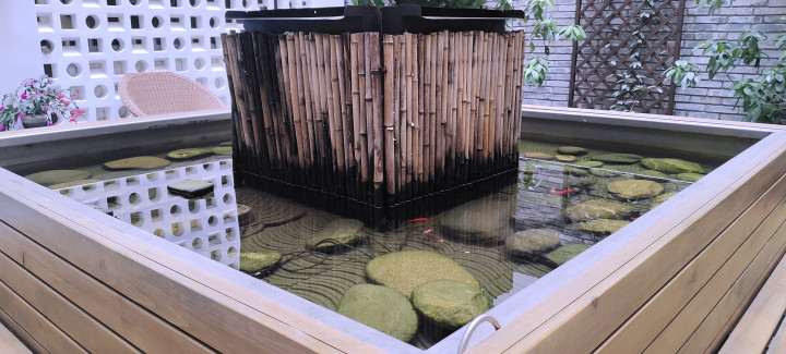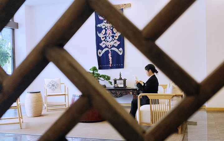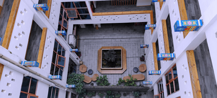 推开酒店大门,首先映入眼帘的是宽敞的接待大厅。这里不仅提供早餐和功夫茶服务,更以墙面上一幅幅质朴的民族风情画,瞬间将人带入平武的历史长河。酒店创始人介绍:“我们想打造的不仅是一个住宿空间,更是一个能‘说话’的文化展厅。”的确,酒店内的四合院微景观、喷泉与明代平武土司出土器皿陈列区,以及收藏的白马人、羌族等民族的生产生活老物件300余件,共同编织出一幅跨越明朝古龙州至今的民俗画卷。游客可以边品茗边欣赏网红天井中游动的红色锦鲤,或驻足于文创产品展区,带走一份属于平武的独特印记。