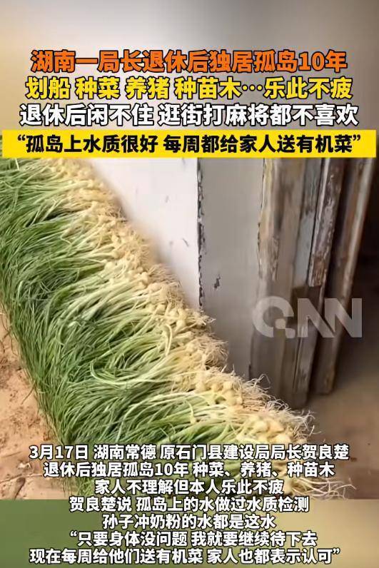 近日,湖南常德原石门县建设局局长贺良楚退休后独居孤岛10年,种菜、养猪、种苗木,家人不理解但本人乐此不疲。